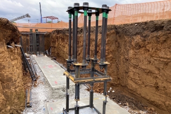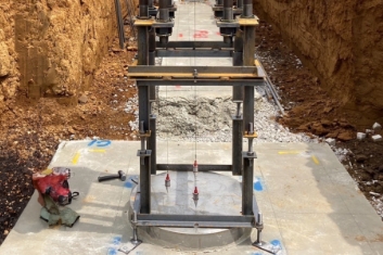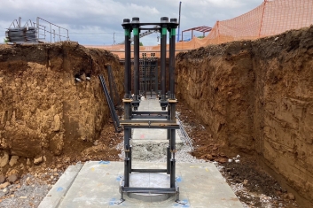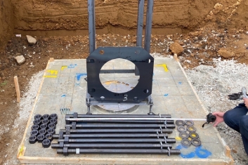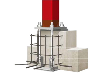 ISベース柱脚工法は、建造物の基礎と柱をつなぐ工事の一つです。角形や丸形の鋼管(鋼鉄製の管)を柱とし、基礎コンクリートと基盤となるプレートを一体化することで、柱脚の固定度を確保しています。耐震性に優れ、建造物の安心・安全を支えています。