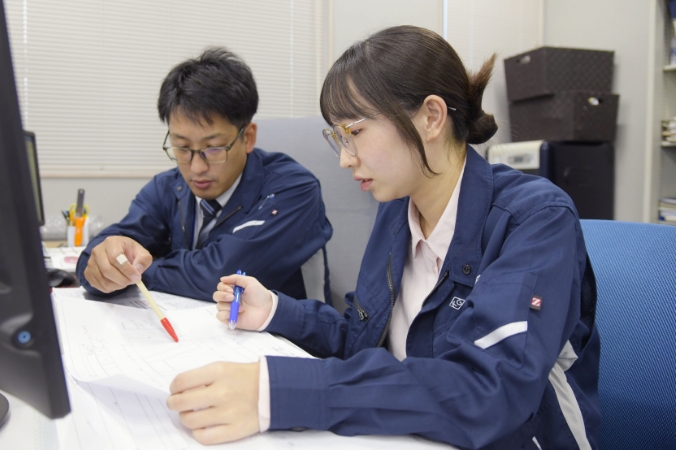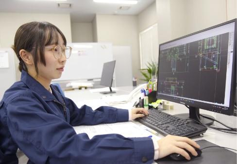 - 編み物など、昔からひとりで黙々作業をするのが好きなので、設計をしているときはとにかく夢中になっています。わからないことがあればすぐに質問し、新しい知識を身につけ、それをすぐに使ってみることを意識していているので、毎日のように自分の引き出しが増えていくことにもやりがいを感じています。はじめて設計した型枠ができあがったときは、大きさやキレイさに感激しました。設計はパソコンの中で行うので、実際のものが出来上がると驚きますね。